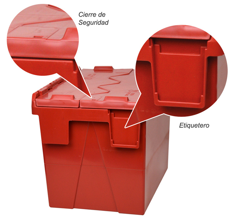 · Dispone de etiquetero. · Sistemas de cierre de seguridad con bridas o con pestañas. · Se pueden encajar reduciendo el volumen en el transporte. · Se pueden apilar en varias alturas cuando la tapa esta cerrada.